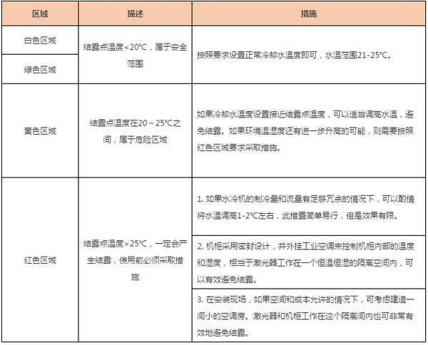 夏季是個(gè)悶熱的季節(jié),不僅氣溫高,空氣的濕度也高,在如此高溫高濕的環(huán)境下,光纖激光切割機(jī)冷卻水的溫度必須設(shè)置恰當(dāng),如果光纖激光切割機(jī)冷卻水溫度設(shè)置低于下表中對(duì)應(yīng)的結(jié)露點(diǎn)溫度時(shí),則會(huì)發(fā)生激光器結(jié)露的風(fēng)險(xiǎn)。